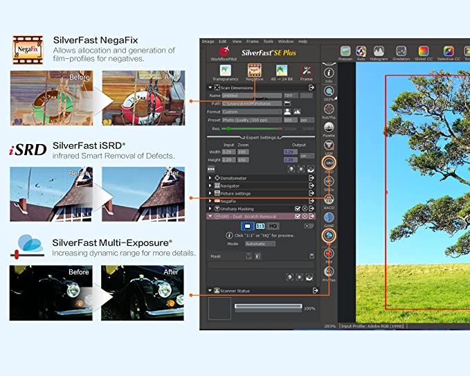 Napredne funkcije – Plustek OpticFilm 8300i SE ima oštar optički sustav koji bilježi izvrsne detalje u sjenama i ima izvanredan tonski raspon. Ugrađeni infracrveni kanal pomaže korisnicima ukloniti prašinu i ogrebotine s originalnih negativa i dijapozitiva bez dodatne naknadne obrade.
